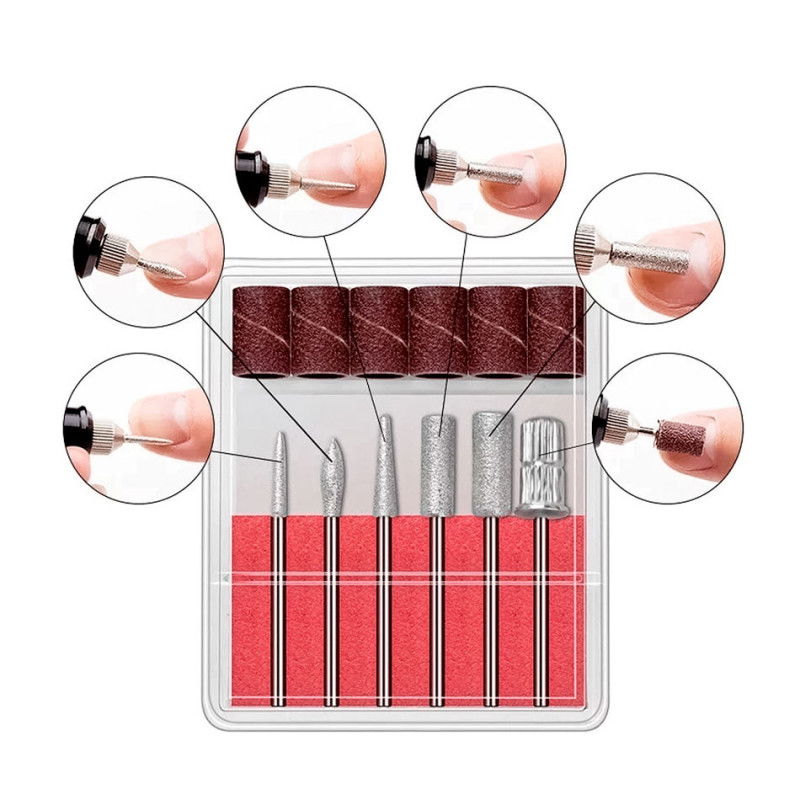 -6 puntas intercambiables + bandas de lijado incluidas, para diferentes funciones: limado, pulido, remoción de gel y acrílico.