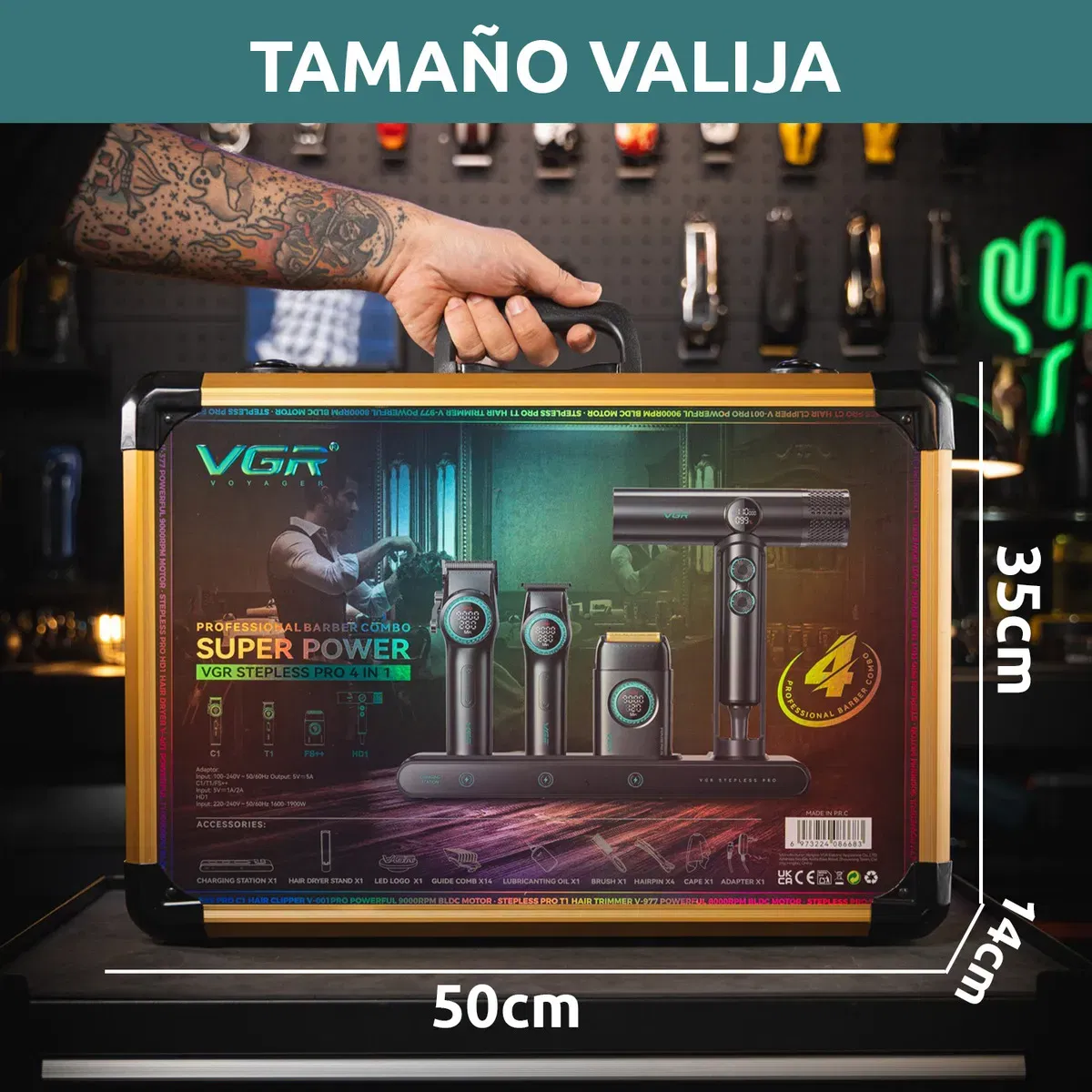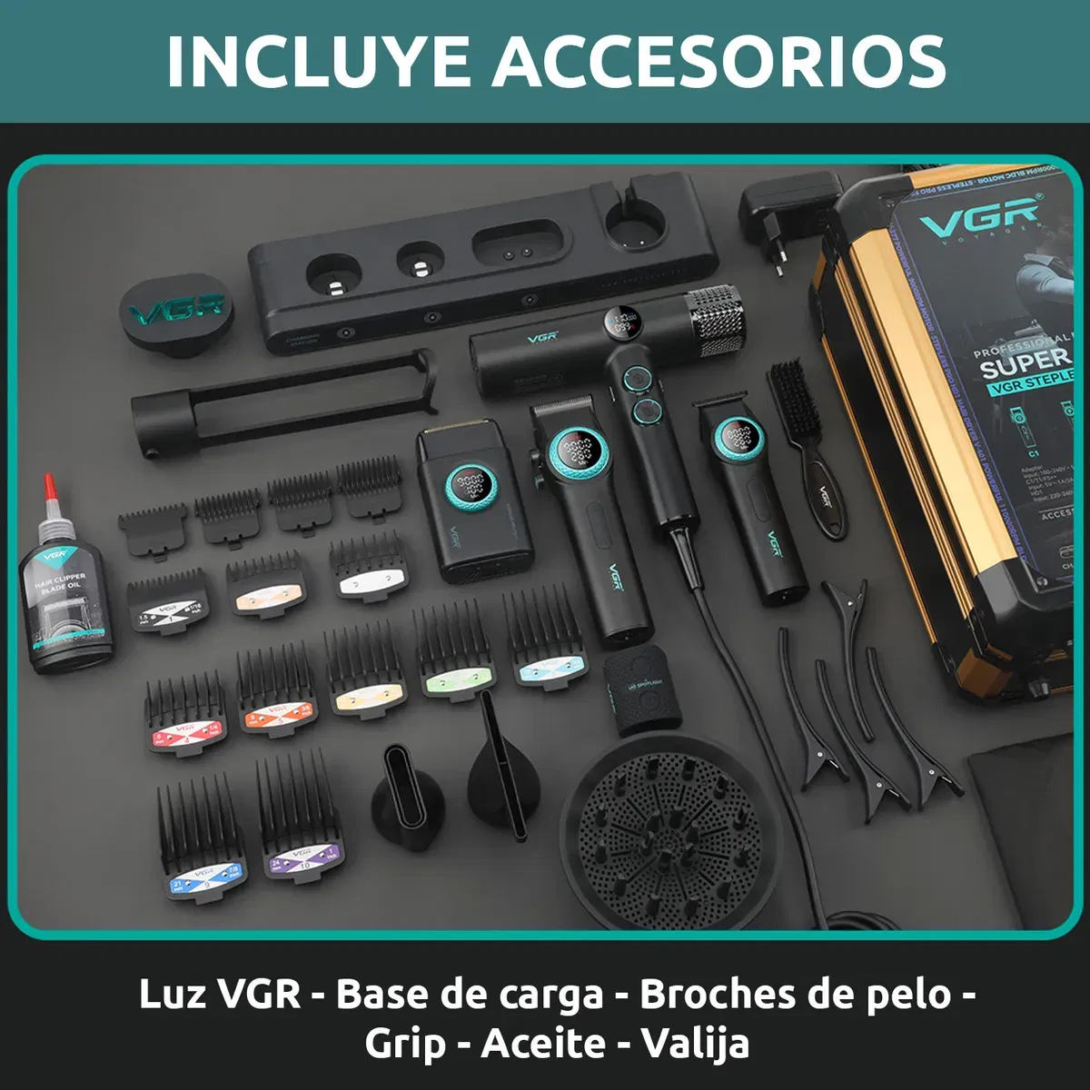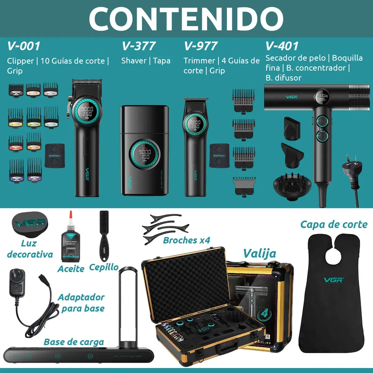 INCLUYE: 1x Maquina VGR V-001 con accesorios 1x Máquina VGR V-977 con accesorios 1x Máquina VGR V-377 con accesorios 1x Secador de pelo VGR V-401 con accesorios 1x Luz decorativa VGR 1x Base de carga 1x Adaptador de pared con cable 4x Broches de pelo 1x Cepillo 1x Aceite 1x Capa de corte 1x Valija
