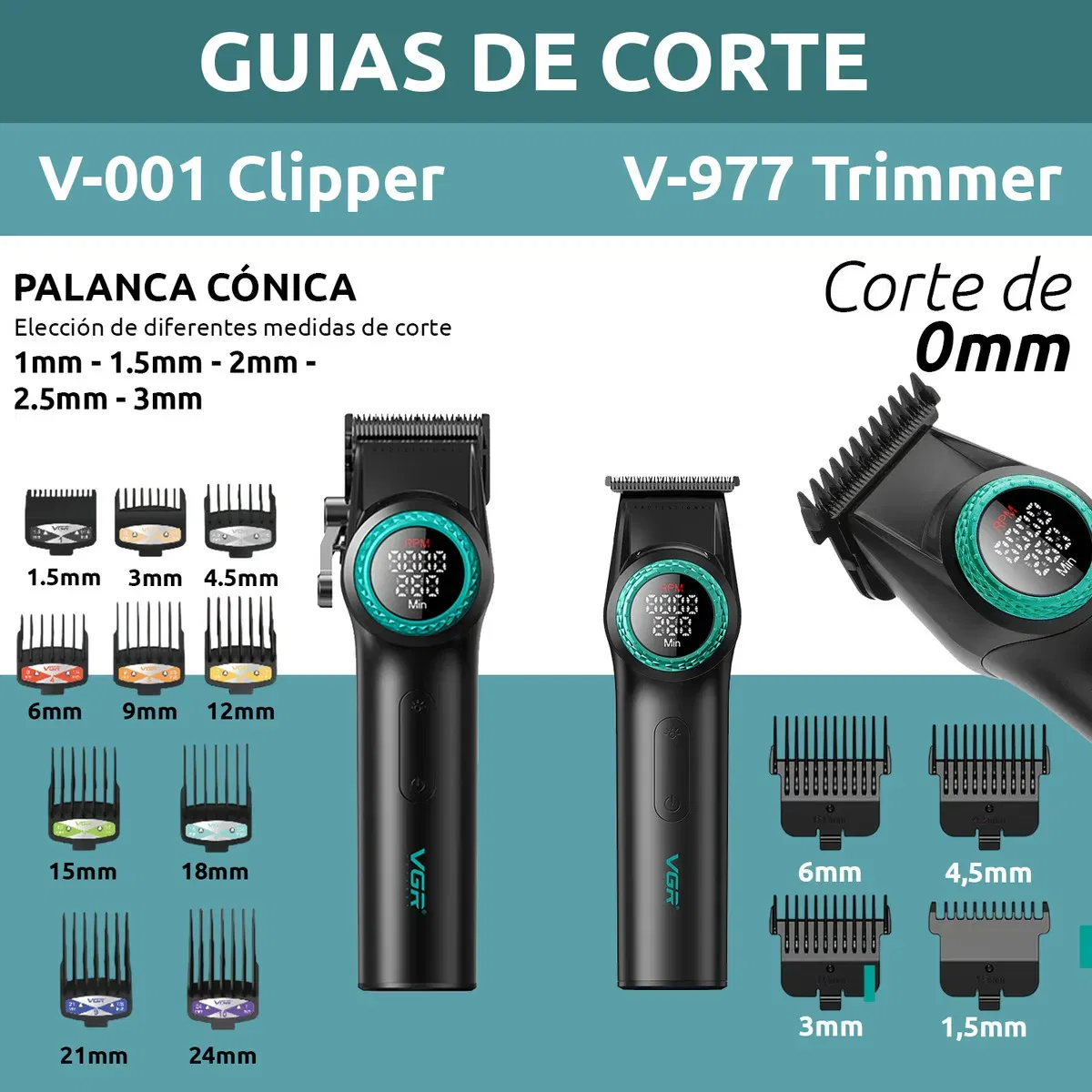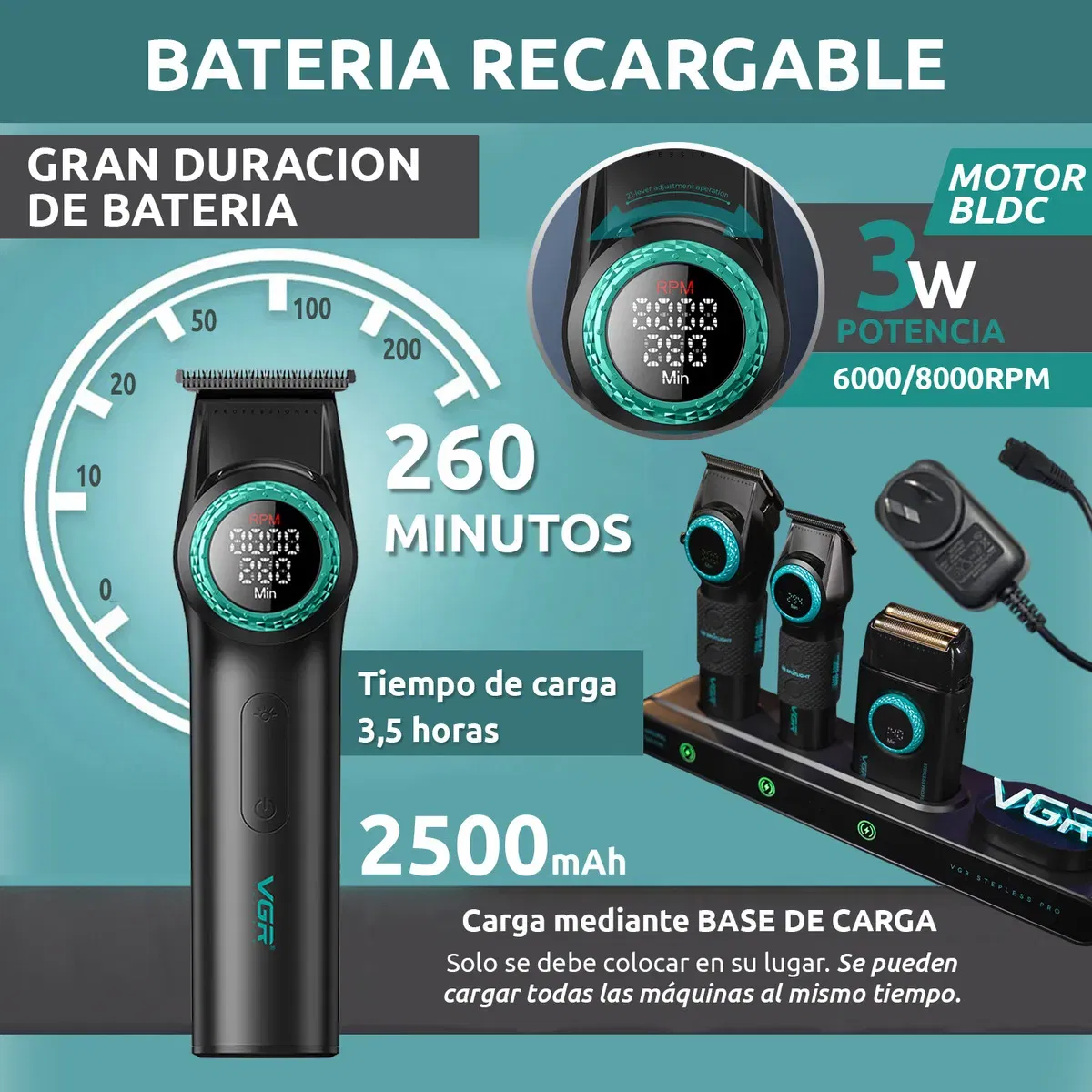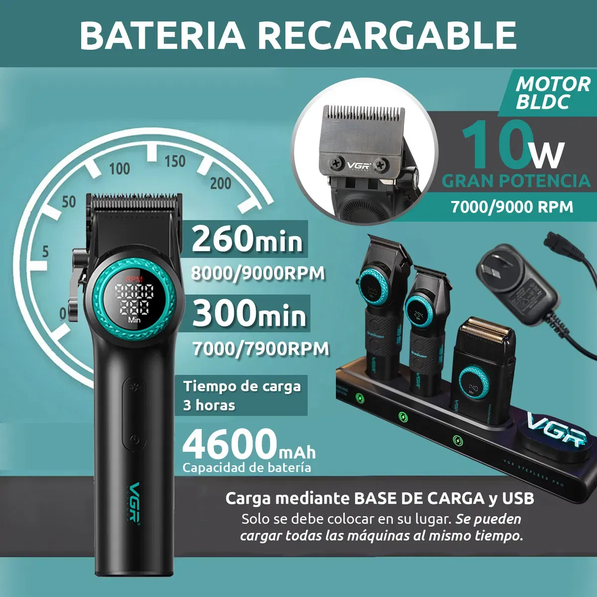 ACCESORIOS INCLUIDOS: Luz decorativa VGR – Base de carga con adaptador de pared – 4 Broches de pelo – Aceite – Cepillo – Capa de corte – Manual – Valija BASE DE CARGA: Todos los productos se pueden cargar a la vez. El cuarto lugar es para colocar el secador de pelo (no cargar, trae cable propio), y también para enchufar la luz de VGR. V-001 PRO MÁQUINA BARBERÍA PROFESIONAL CORTA PELO VGR V-001 9000 RPM La mejor máquina de cortar pelo para barberos y peluquerías, también ideal para uso doméstico. Esta cortadora de pelo de alta gama combina potencia y precisión, convirtiéndose en la elección perfecta para quienes buscan la excelencia en el cuidado personal. Con una velocidad de hasta 9000 RPM y cuchillas de cerámica y DLC, esta máquina de cortar pelo profesional garantiza un rendimiento superior. Características: Material del cuerpo: Metálico Material de la cuchilla: Hoja de revestimiento DLC y cerámica Batería: 4600 mAh Motor BLDC Potencia: 10W Velocidad: 7000 a 9000 RPM Tiempo de carga: 3-6 horas Tiempo de uso: 260 a 300 minutos Peines límites de corte: 1.5/3/4.5/6/9/12/15/18/21/24 mm Puerto de carga: Tipo C Indicador LED Botón de encendido y apagado Palanca con 5 ajustes: 1.0/1.5/2.0/2.5/3.0 mm Pantalla indicadora de RPM Visualización de tiempo de uso restante 21 niveles desde la perilla giratoria Luz LED para mejorar la iluminación en la zona de corte Tamaño de la Clipper: 18.5 cm de alto x 3.5 cm Largo del cable: 1,75m Incluye: 1x Máquina VGR 10x Peines límites 1x Grip V-977