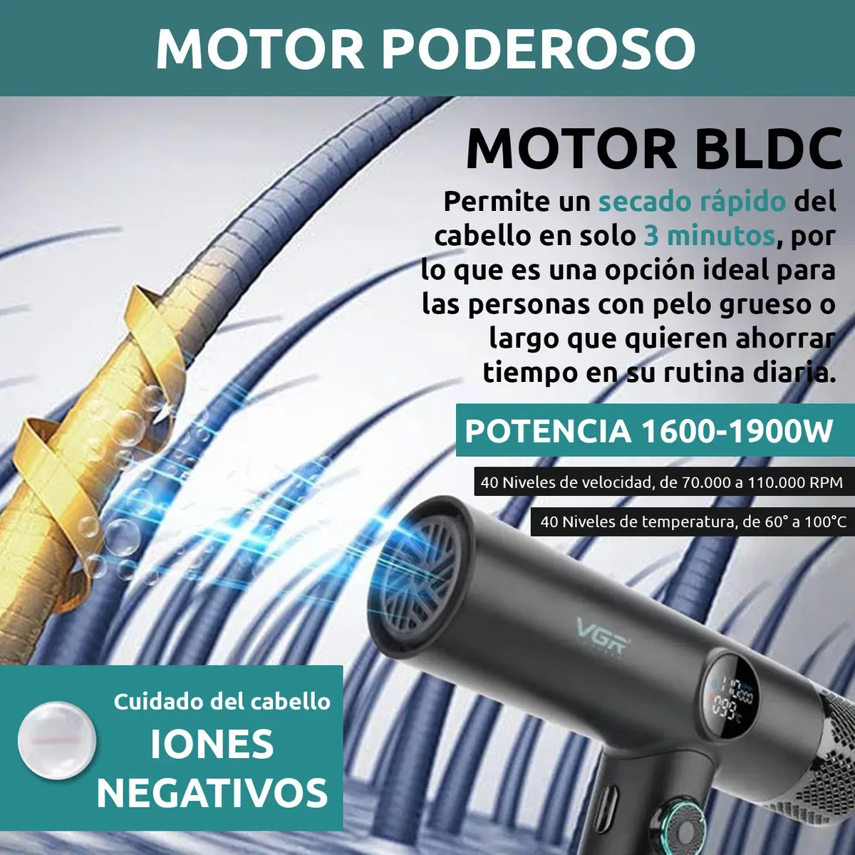 SECADOR DE PELO PROFESIONAL VGR V-401 SALON TURBO 1900W FRIO / CALOR Características: Material: ABS Potencia: 1600-1900W Motor BLDC 40 Ajustes de velocidad Velocidad: 70.000 RPM a 110.000 RPM 40 Ajustes de temperatura Temperatura 60° a 100° Secado en frio/calor Especificaciones del cable: H05VV-F 2x1,5 mm² Medidas: Tamaño: Alto 17cm x Ancho 19cm x Espesor 4,5cm Peso: 396g Largo del cable: 2,3 metros Incluye: 1x Secador de pelo VGR con cable 1x Boquilla fina 1x Boquilla concentrador 1x Boquilla difusor