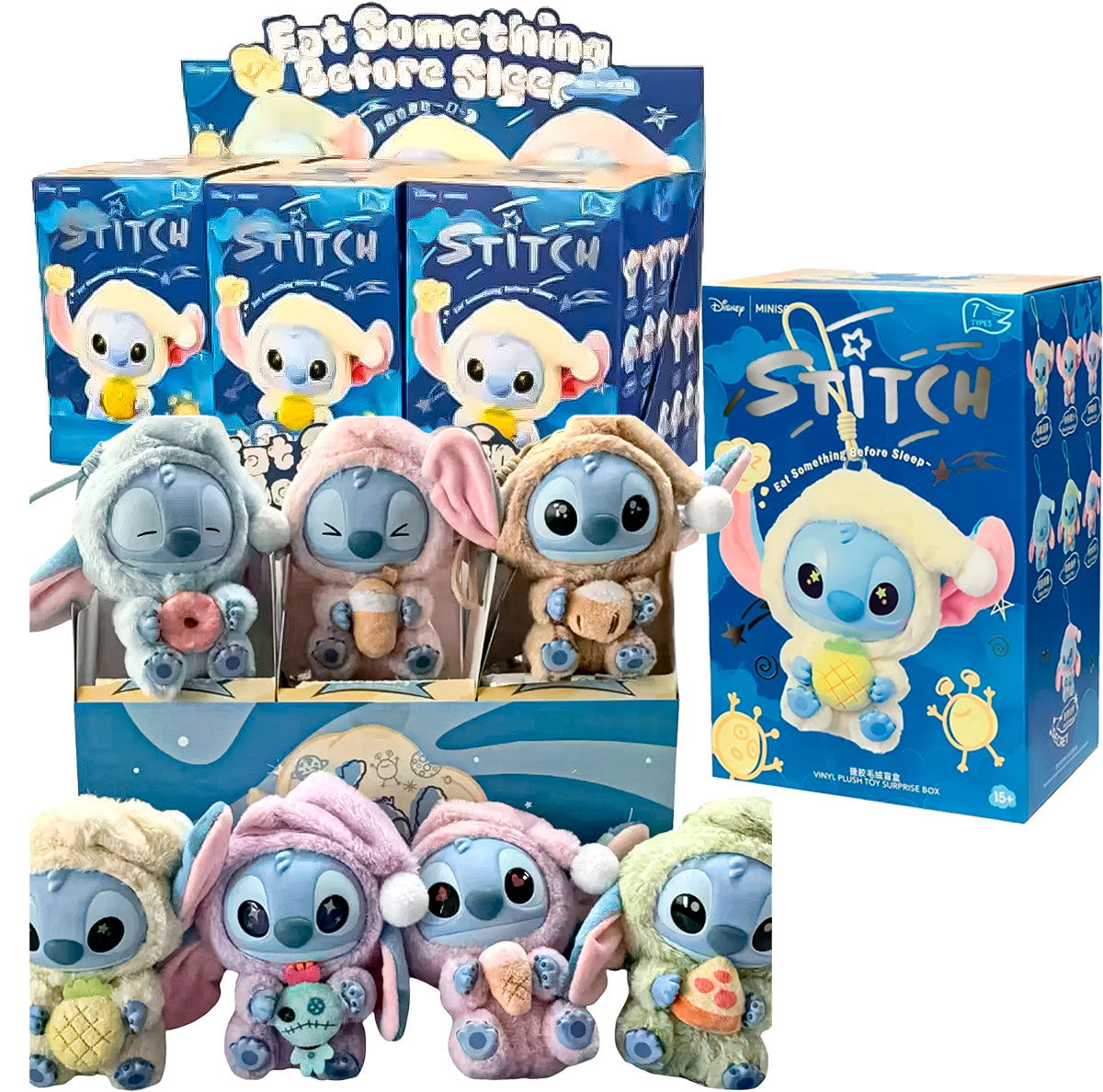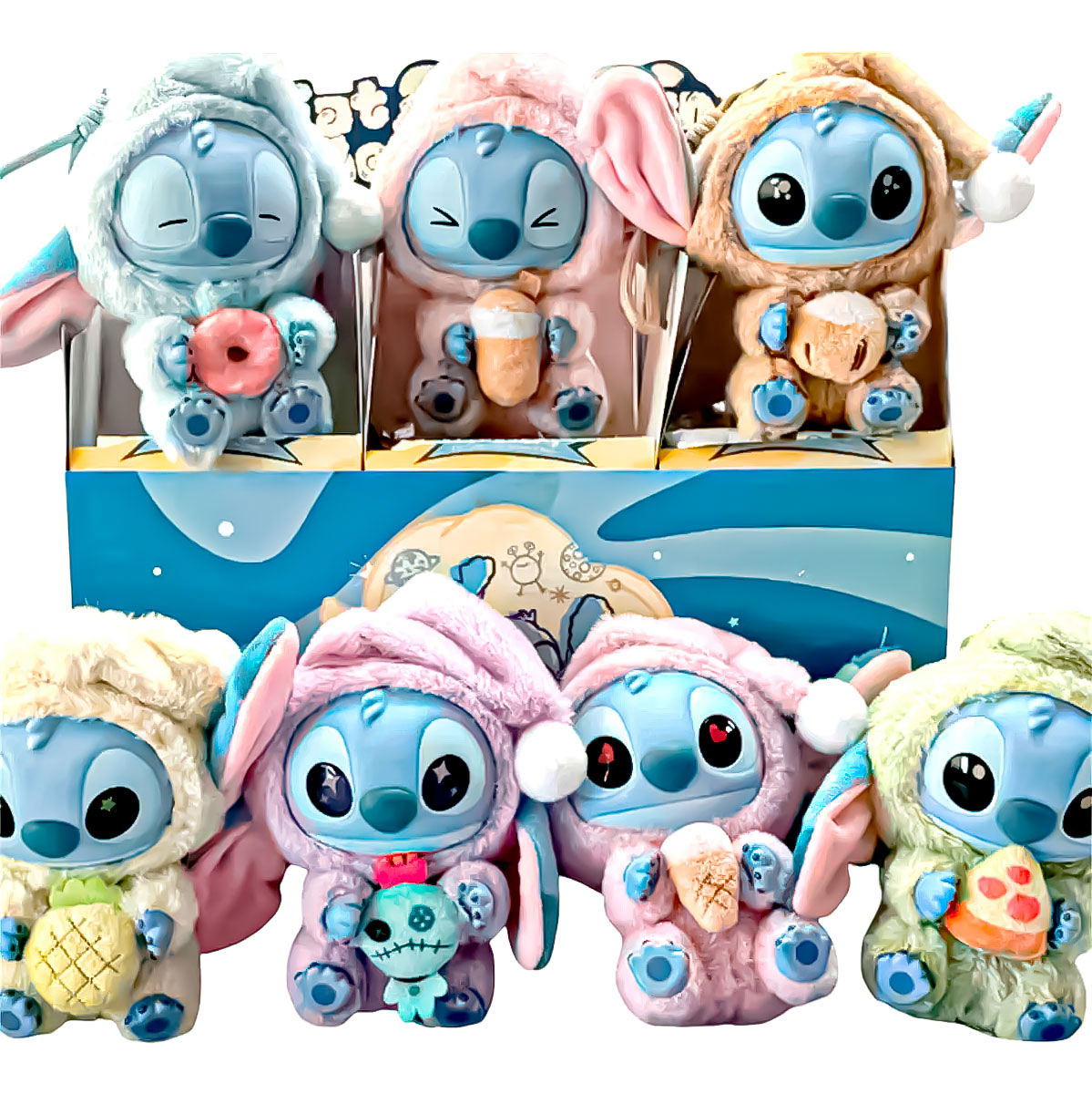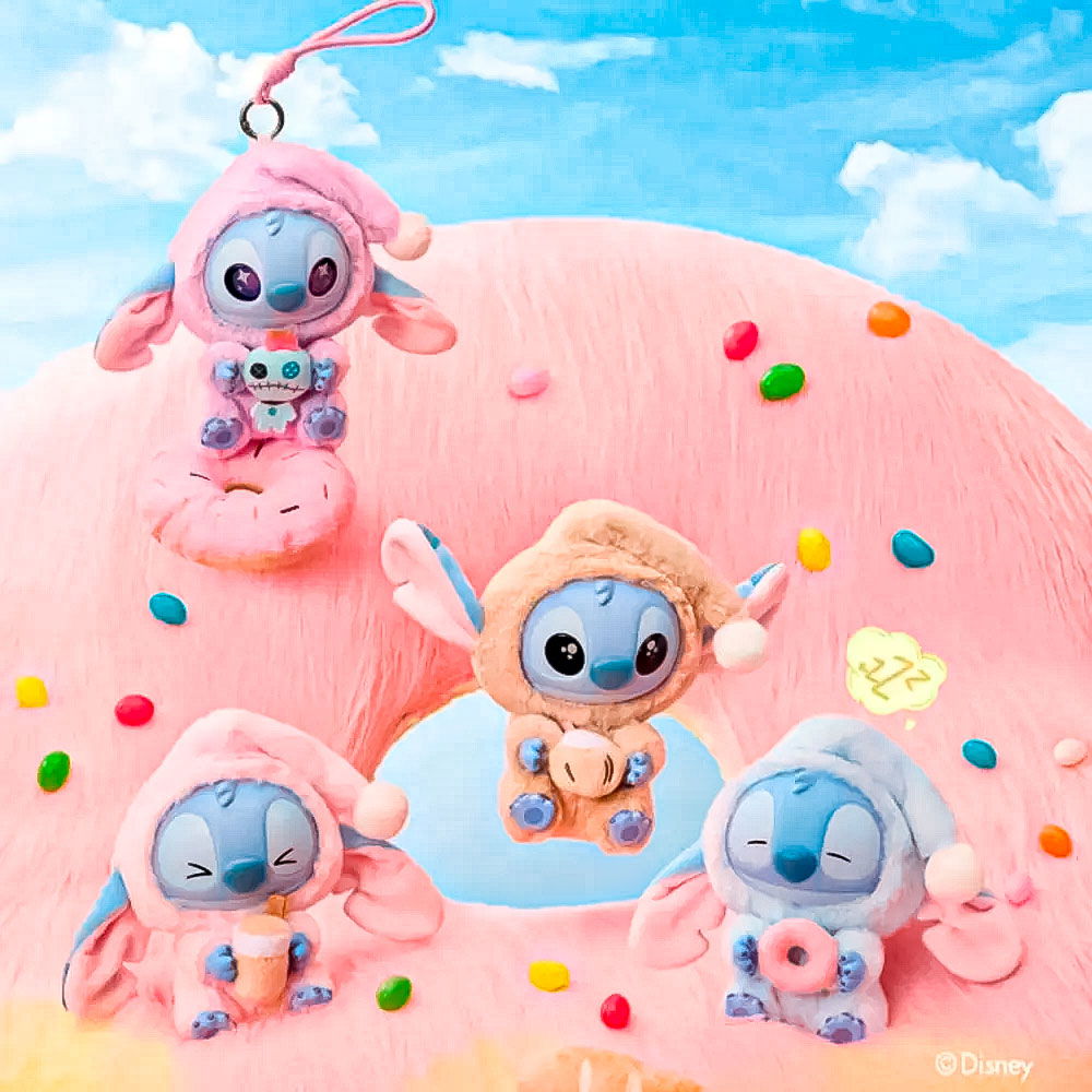 Disfrutá de esta encantadora colección inspirada en el adorable personaje de Disney, donde cada caja contiene un Stitch diferente, vestido con suaves trajes de felpa y sosteniendo dulces bocadillos antes de dormir.